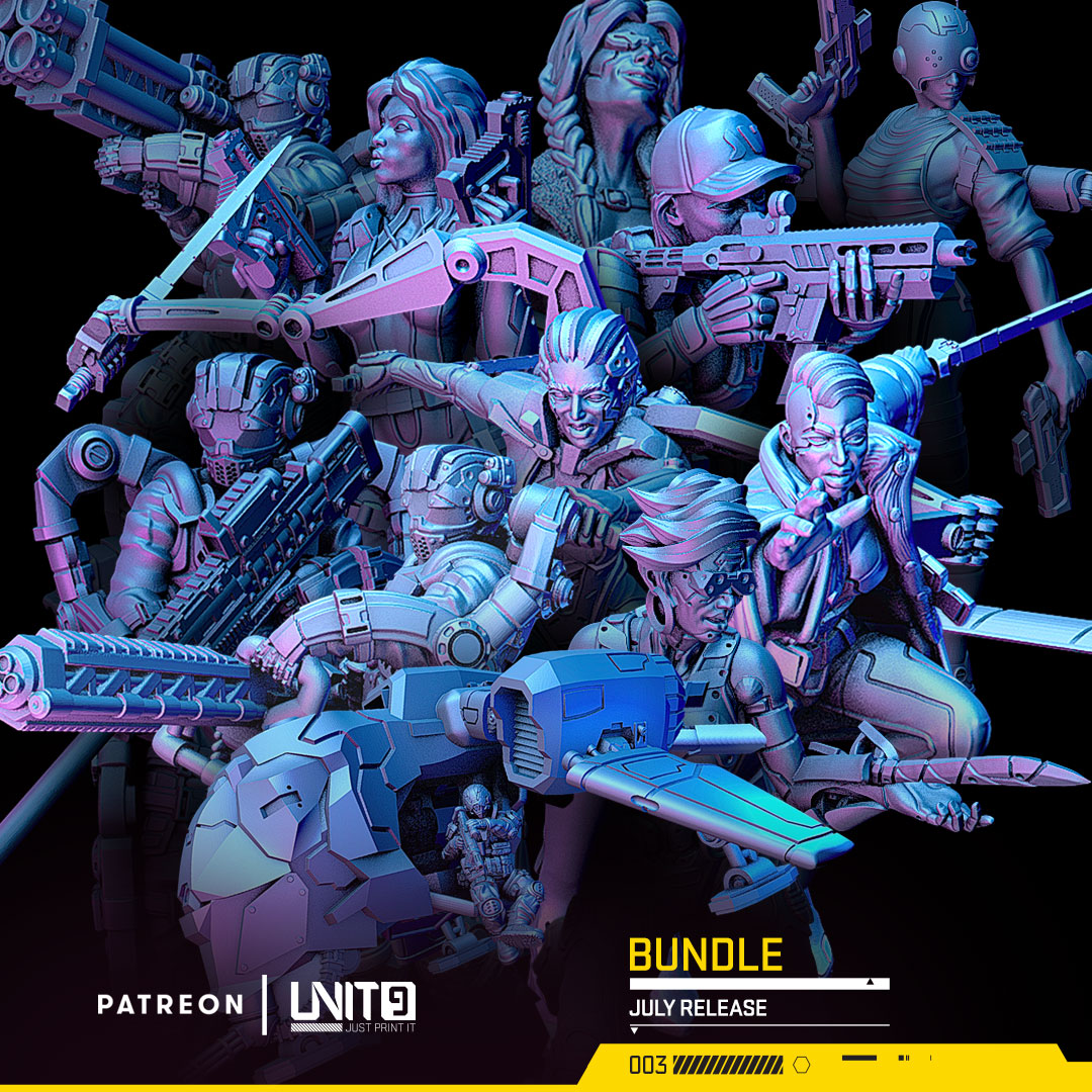 A resin Proxy Wars team with standard bases for cyberpunk genre tabletops like Human Interface Proxy Wars. Unit cards for Human Interface Proxy Wars are included for free to print out yourself. The cards may not yet be available at the release of the miniatures.